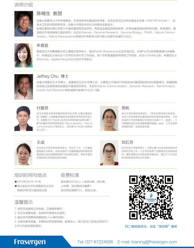 今年9月开学季将由加拿大西蒙菲沙大学终身教授、生物信息学和基因组学专家陈楠生博士以及菲沙基因信息有限公司首席技术官Jeffery Chu博士等组成的顶尖技术团队带您一起揭开三代测序面纱。