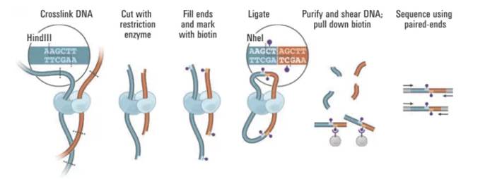 4. 解交联,使DNA和蛋白、蛋白和蛋白分开,提取DNA,打断,捕获带有生物素标记片段,进行建库;
