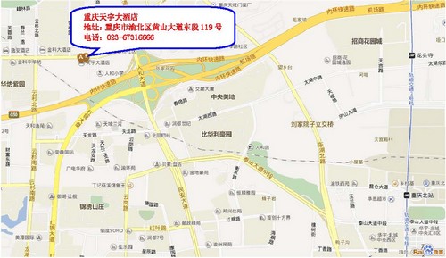 到达路线:1)重庆江北国际机场→天宇大酒店:乘出租车, 20分钟车程。2)重庆火车北站→天宇大酒店: 乘出租车, 10分钟车程。3)轨道3号线→天宇大酒店:金童路站下(2号出口),换乘126路公交,到汪家桥站下,10分钟车程。