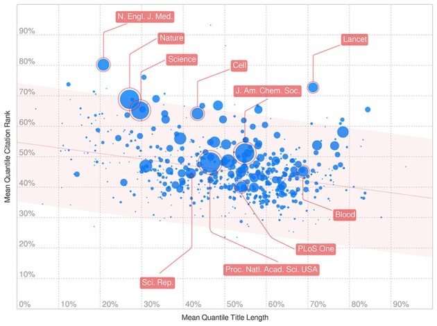 然而,在考虑整个期刊的总引用率时(不是单篇论文),以上提到的影响因素就不存在了。研究人员发现,发布短题目的期刊每年会获得更多的引用。不过也有例外的,医学期刊The Lancet和The Lancet Oncology尽管使用了较长的题目,但依然获得了很高的引用次数。而Journal of High Energy Physics尽管使用了较短的题目,但是积累的引用还是很少。