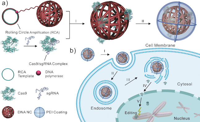 如上图所示,“DNA纳米纱团”输送平台包括四个主要步骤:(一)“DNA纳米纱团”的制备。北卡州立和北卡大学的联合课题组通过“滚环DNA扩增技术”(Rolling Circle Amplification,RCA)合成含有一段和CRISPR-Cas9单导RNA互补的,而且含有重复的反向DNA片段的单链DNA。这种DNA随之自组装形成一种象“纱团”一样的DNA纳米粒;(二)装载CRISPR-Cas9。“DNA纳米纱团”能通过互补的DNA序列“吸附”CRISPR-Cas9复合物;(三)阳离子外壳涂层。在吸附了CRISPR-Cas9的“DNA纳米纱团”外层涂上聚乙二胺(PEI)外壳以增加纳米粒的稳定性;(四)进入细胞核并实现基因编辑功能。装载有CRISPR-Cas9的高度阳离子化的“DNA纳米纱团“纳米粒能通过内化进入细胞,再通过Cas9融合多肽进入细胞核并实现基因编辑。整个过程大致需要6小时。