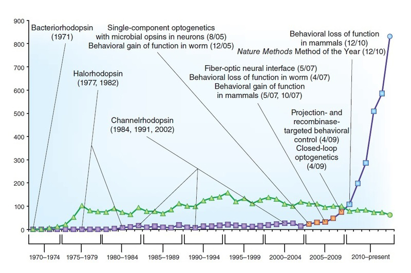 尽管光遗传学一出现就遭遇到了一些坎坷,但其新奇的想法深深地吸引了全世界的科研工作者开发这个工具。随后的两年,这种可以轻而易举地在神经元中表达的蛋白质帮助神经科学家在多个层次上取得突破,如构建并富集稳定耐受的表达载体,体外实时检测电生理水平、成像水平及行为水平的数据,设计并安装用于体内光传递和行为学控制的神经接口……