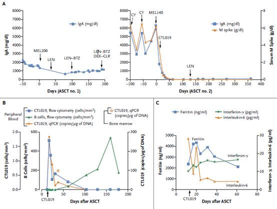 患者接受140mg/m2剂量(从标准剂量的200mg/m2降低以最大限度减少毒性作用)的马法兰后进行自体干细胞移植。移植相关性毒性反应包括4级白细胞和血小板减少,3级黏膜炎,2级恶心和厌食,中性粒细胞减少发热和金黄色葡萄球菌菌血症。在接受CTL019输注当天(移植后第12天),中性粒细胞绝对数已升至200/立方毫米,患者无发热且无菌血培养超过48小时。CTL019剂量为5×107个表达嵌合抗原受体的T细胞。与马法兰给药前的淋巴细胞绝对数390/立方毫米相比,CTL019输注当天淋巴细胞绝对数840/立方毫米(T细胞占49%)。CTL019输注后,没有发烧或出现细胞因子释放综合征的迹象,炎性反应已在其他CTL019临床试验中被观察到。在移植前患者有低丙种球蛋白血症,这常见于多发性骨髓瘤患者;在移植后100天这一现象仍然存在,这归因于CTL019对正常B细胞和浆细胞的影响。没有观察到其他CTL019相关性不良反应;早期没有特别指出的不良反应都为1或2级。移植后经过100天,所有移植相关性毒性反应已得到处置。在移植后130天使用来那度胺,剂量为5mg/天;由于胃肠毒性反应随后剂量调整为每周2次,每次5mg。
