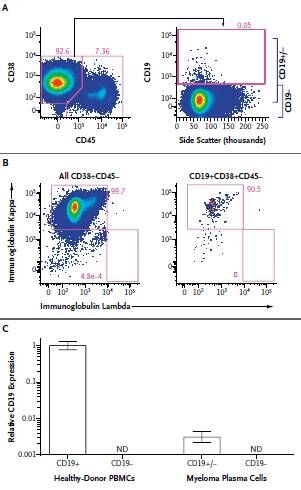 以患者接受自体移植前作为基线进行骨髓穿刺,通过流式细胞术来分析多发骨髓瘤中CD19的表达。可以确定在浆细胞瘤中以CD38+ CD45-免疫表型和kappa 轻链限制性占主导地位(图3)。多发性骨髓瘤浆细胞群体中CD19仅占0.05%(图3A)。微量的CD19+亚群表达细胞内kappa轻链(图3B)和B细胞成熟抗原(BCMA),这是浆细胞特异性标志物(未示出),证实了其作为恶性浆细胞群体的一部分。此外,在CD19+一个小亚群CD45+细胞中检可识别到一小集群Kappa限制性浆细胞(图4,阴影内图片)。基线骨髓样本中其他的CD19+集群包含多克隆CD19 + CD20+ B细胞和小部分CD45 + CD38(阴性)+ CD20-CD19 +轻链阴性细胞,很可能是pro-B细胞或幼稚pre-B细胞(图4)。为了更灵敏地鉴定CD19的表达,我们使用FACS在CD19表达的2个阈值下对占主导的浆细胞集群进行分选(图3A),并且我们通过RT-PCR测定法分析了分选的浆细胞CD19信使RNA(mRNA)的存在。通过流式细胞术检测99.95%骨髓瘤浆细胞为CD19阴性的细胞没有检测到CD19mRNA(图3C)。