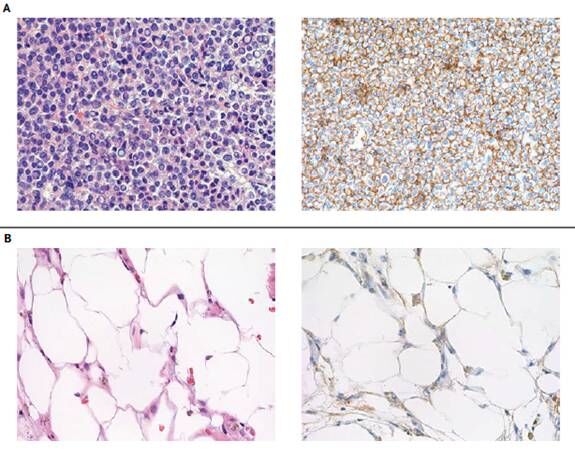 第二次ASCT前骨髓穿刺活检(图A)HE染色(左)和CD138免疫染色(右)显示超过95%为多发骨髓瘤。在第二次ASCT后100天获得的取样(图B)HE染色(左)和CD138免疫染色(右)显示整体细胞密度为1-2%并且没有浆细胞。