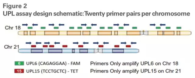 上述设计思路在RainDance公司编号为LCN 50-07052 Rev A的Application note中已经进行了初步尝试,具体实验方案见下图。对21号染色体和18号染色体分别检测20个位点,采用Roche公司的Universal Probe Library (UPL),其中18号染色体采用FAM检测,21号染色体采用TET检测。当然,实验人员也可以根据NGS的结果来选择染色体上的具体位点及检测位点的个数。