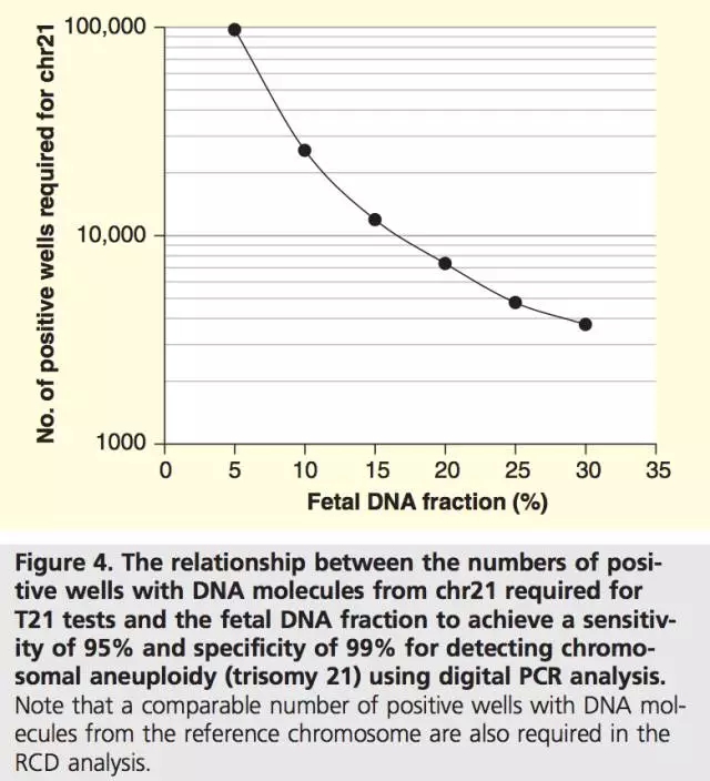 通过上述计算,采用数字PCR技术进行非整倍性分析几乎是不可能的,因为在常规采血量的条件下不可能获得如此数量级的分子数。但如果对目标染色体与内参染色体上进行多个位点的同时检测(多重检测),可以在不提高采血量的情况下增加被计数分子的总数目。这不失为一种利用数字PCR技术进行非整倍性分析的思路,原文如下: