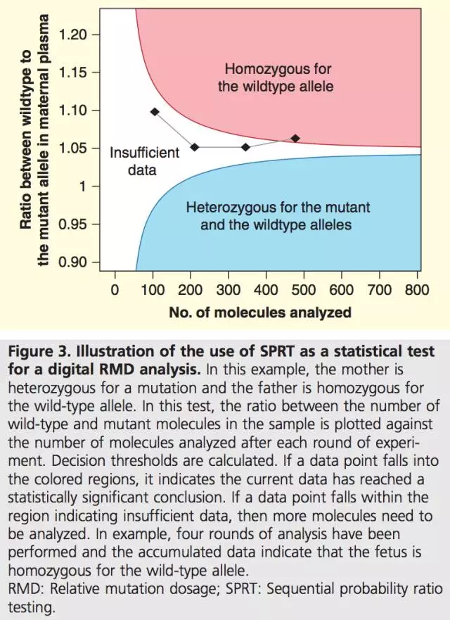 下图的例子中,母亲是某种常染色体显性遗传疾病的携带者,父亲是纯和野生型。其中横坐标是母体血浆中总共被分析的分子数,纵坐标是野生型对突变型的比例。如果该比例落在颜色区域,结果则具有统计学意义。如果落在红色区域,说明胎儿的基因型为野生纯和;如果落在蓝色区域,说明胎儿的基因型为杂合。SPRT分析中,实际需要分析的分子总数目不能在实验前确认。下图的例子中显示,总共经过了4轮测试得出具有统计学意义的结果。这种分析策略可以用于诸如地中海贫血、血友病和甲基丙二酸血症等遗传病的检测。