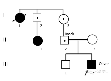 图一. Wuth 家系图谱,箭头表示患病的Oliver。