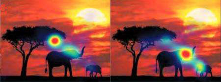 自闭症患者关注与正常人不同,其中,左图是自闭患者的观察模式,右图是正常人的观察模式。