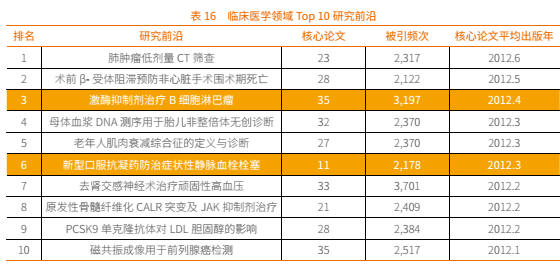 医学领域中,“新型口服抗凝药防治症状性静脉血栓栓塞”和“激酶抑制剂治疗B细胞淋巴瘤”均聚焦于新型药物替代常规方法治疗疾病,“激酶抑制剂治疗B细胞淋巴瘤”热点前沿致力于致命血癌的治疗。
