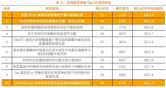据报道,其中生物领域的前沿群包括CRISPR/cas基因组编辑技术和RNA病毒所致流行性疾病。其中,在热点前沿“新型H7N9禽源流感病毒的传播与致病机理”中,中国学者发挥了重要的作用。