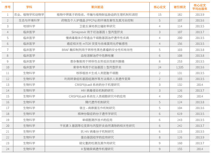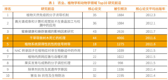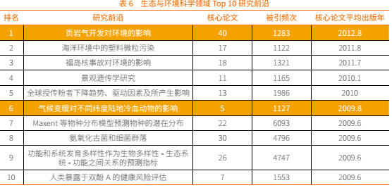 在农业、植物和动物学领域,植物抗逆性的研究组成了“植物应对生物和非生物胁迫的分子机制和调控”前沿群。生态与环境科学领域中,行成了2个前沿群,即“资源开发和利用对环境和健康的影响”前沿群和“生物多样性遗传、形成和维持机制研究”前沿群。在地球科学领域中出现2个前沿群,其中“中国华北克拉通的变形历史研究”是中国特有的。