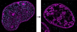 这种压缩状态的染色质会抑制DNA的转录水平。当压缩逆转后,转录水平上调,且比正常水平高。研究人员进一步发现,比较正常细胞,脱氧核糖核酸酶的活性降低,且组蛋白H1表达量也显著降低。