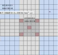 其中最中间的方格分为25个中格,每个中格又被分为16个小格,因此计数室中一共有400个小格。每次计数时选取图3中红色部分计数,计数结果乘以5得到一个计数室中总的细胞个数