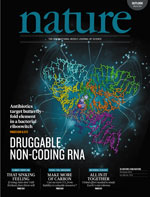 2015年10月29日那一期的Nature封面,展示的是与一个细菌核糖开关的RNA适配体结合在一起的小分子Ribocil的结晶结构。背景图像突显了,该核糖开关适配体在Ribocil结合时所观察到的“蝴蝶折”构形。人们都知道迫切需要新型抗生素。现在,默克公司的Terry Roemer及同事,描述了针对一个细菌核糖开关的新型合成抗生素。核糖开关是非编码RNA片段,其结构受某一个配体的影响,该配体通常与被含核糖开关的基因编码的蛋白的功能相关。这种新药(即Ribocil)阻断核黄素生物合成所需的ribB基因的表达。该基因由“黄素单核苷酸核糖开关”介导。Ribocil 抑制细菌细胞生长,在一个小鼠模型中能有效治疗细菌感染。封面图片: Sharn M. O’Brien