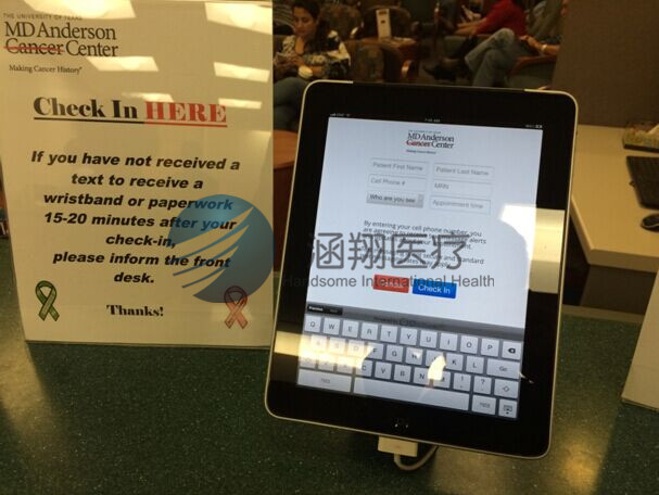 在预约的时间到达预约的地点后,使用医院提供的Ipad做一个“Check In”,输入病历号和手机号码等信息。接下来,等待短信提醒。
