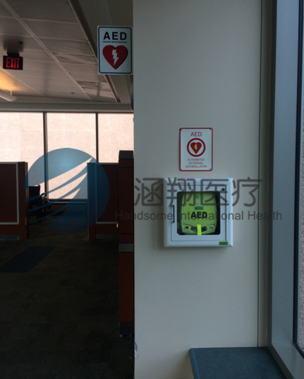我在医院里发现了很多写着AED的小仪器(后用手机查询,AED=Automated External Defibrillator,是自动体外除颤器的英文缩写)。是一种用于突发心脏病病人的抢救设备。陪我们看病的涵翔医疗职员William说,其实AED在美国公共场所非常普遍,机场、剧院、体育馆内都有大量配置,而且标示明显。William也说,更重要的是在美国,会使用AED的人员比例很高,很多没有医学背景的民众都会使用。另外,如果取下墙上的AED,也会触发警报,向急救中心报告事发位置,急救人员就会迅速赶来。