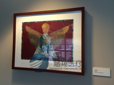 这幅《天使在祈祷》(也是我给命名的),是另一个叫Chloe的8岁小朋友画的,毕竟比Gatlin年长了两岁,构图和用色更老道。就挂在我们每次去见医生路过的走廊上,我和先生都觉得看着很温暖。