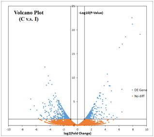 如图1.1所示,符合差异表达条件的基因在图上以蓝色圆点表示;