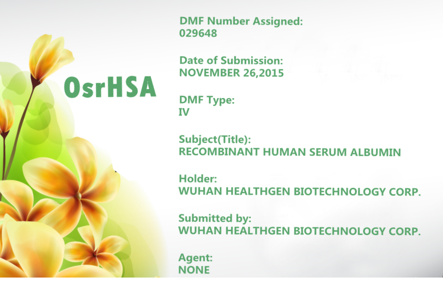 武汉禾元生物科技股份有限公司(以下简称“禾元生物”)生产的植物源重组人血清白蛋白—OsrHSA正式获得美国食品药品监督管理局(FDA)DMF文件号。这表示国际市场对禾元生物水稻生物反应器的高度认可,也意味着植物源重组人血清白蛋白可进入欧美市场进行销售。