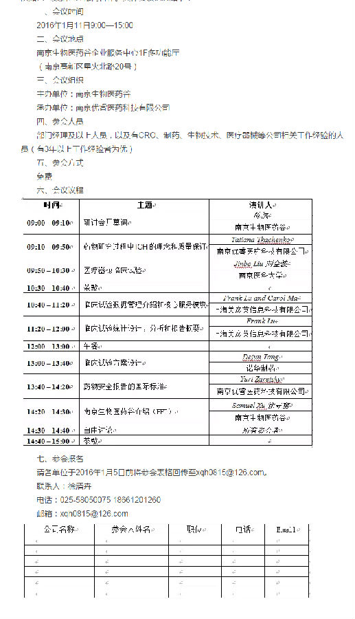2016年1月11日,由南京生物医药谷主办、南京优睿医药科技有限公司(加拿大专业CRO公司ZM总裁DR. YURI ZARETSKY独资控股)承办的 “透视临床试验最新进展趋势”研讨会将在南京举行。此次研讨会旨在探讨国际国内有关医药、生物等专业技术领域的前沿信息和最新发展趋势;并探讨相关重要药物安全信息,包括药物警戒和临床试验数据审核,以及临床项目团队如何与数据管理部门合作。