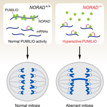 科学家们意外地发现,NORAD在维持基因组稳定中发挥了至关重要的作用,并完成了一些实验证实当缺失NORAD时,细胞经常会丢失或获得整个染色体。显微成像揭示缺失NORAD的细胞无法在分裂之时正确传递染色体。在细胞分裂过程中NORAD通过调控一个叫做PUMILIO的蛋白质家族的活性控制了染色体分离。在缺失NORAD的细胞中,PUMILIO过度活化会导致基因组不稳定。由于大多数癌细胞也显示基因组不稳定,Mendell博士和他的研究小组现正在探究NORAD或PUMILIO蛋白功能异常是否促成了人类肿瘤。
