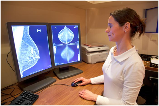 医生正在操作乳腺钼靶X线放射仪器,查看被检者是否有乳腺癌或其他胸部异常情况(图片来自medicalnewstoday.com)