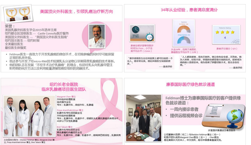 谢尔登▪费尔德曼医生是美国治疗乳腺癌的顶级专家之一,也是纽约长老会医院/哥伦比亚大学医学中心乳腺癌科室主任。他获得过多项专业荣誉,并被美国最权威顶级名医录入机构Castle Connolly选入顶尖医生,2015年,谢尔登▪费尔德曼博士获任美国乳腺外科医生协会主席。至今,他在乳腺癌诊疗方面已有四十年的临床经验。此外,谢尔登▪费尔德曼医生还带领了一支优秀的团队,例如在美国长大的华人Dr. Chen,她中文流利,能与中国患者直接交流,所以他经常在华人社区对医生及民众讲解乳腺肿瘤的防治。在乳腺癌治疗方面,谢尔登▪费尔德曼医生领导的小组擅长于乳腺癌的微创手术以及乳房重塑,可以令患者术后的乳房与术前几乎没有差别,这极大地提高了女性,尤其是年轻女性的生活品质。此外,乳腺癌做淋巴结清扫后经常导致患者手臂肿胀,谢尔登▪费尔德曼医生与他的小组解决了这个问题,从而提高患者的生活质量。