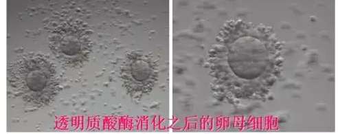 中午12点左右,我和我的姐妹们被一根细管吸入另一个液滴中,被反复快速吹打着,这种液体是透明质酸酶,它能够在短时间内迅速消化掉我外面层层包裹着的颗粒细胞。30秒钟后,我的周围只剩下少数3~5层颗粒细胞,他们呈放射状排列,因此被形象的称为“放射冠”。