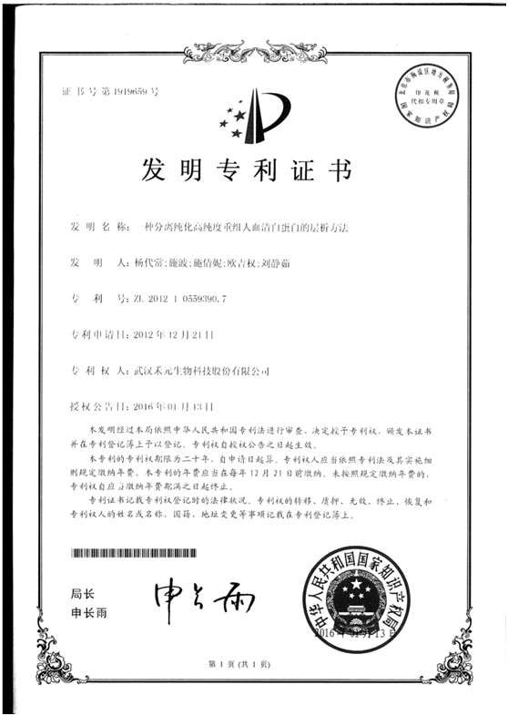 禾元生物获得由中华人民共和国国家知识产权局颁发的“一种分离纯化高纯度重组人血清白蛋白的层析方法”专利证书。