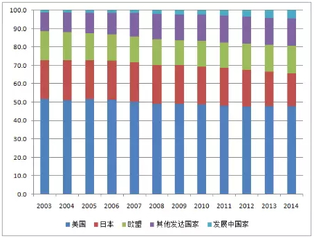 注:专利按照所列全部发明者所在地以分数形式分配到地区/国家/经济体。欧盟包括28个成员国。发达经济体是国际货币基金组织(IMF)分类为“先进”的,发展中经济体是IMF分类的“新兴”。数据来源:科学与工程指标2016