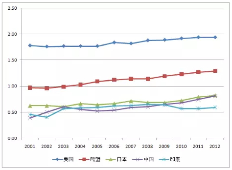 图2 美国、欧盟、日本、中国和印度科学与工程论文在全球前1%高被引论文占比:2001-2012年(%)