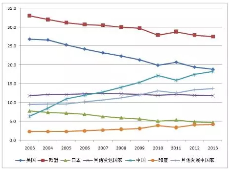 图1 所选地区/国家/经济体的科学与工程论文全球占比:2003-2013年(%)