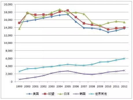 图4 全球三方专利数,按所选地区/国家/经济体:1999-2012年