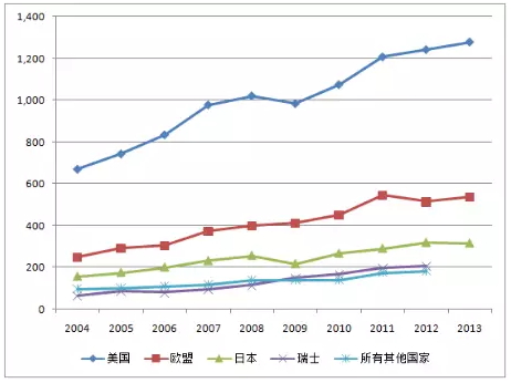 图3 美国专利和商标局(USPTO)批准专利,按发明者所在地:2003–2014年