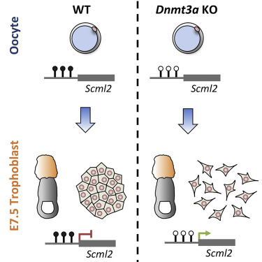 通过构建Dnmt3a/3b突变体,阻断小鼠卵子的甲基化,研究者发现在卵子发生过程中产生的甲基化是正确的胎盘发育的关键。而关键的胎盘调节因子Ascl2印迹,只有部分负责这些影响。特别是,该研究确定了几个涉及细胞的粘附和迁移的基因,由卵细胞甲基化所调节。具体来说,胎盘特异性DNA甲基化和Scml2的沉默相关。Scml2是一个Polycomb抑制复合物蛋白,在甲基化缺陷的胎盘中会让其丢失细胞粘附的功能(如图)。这两个基因对于胎盘发育,建立与母体组织的连接,以及支持胚胎发育都很重要。