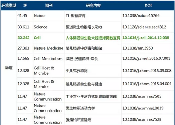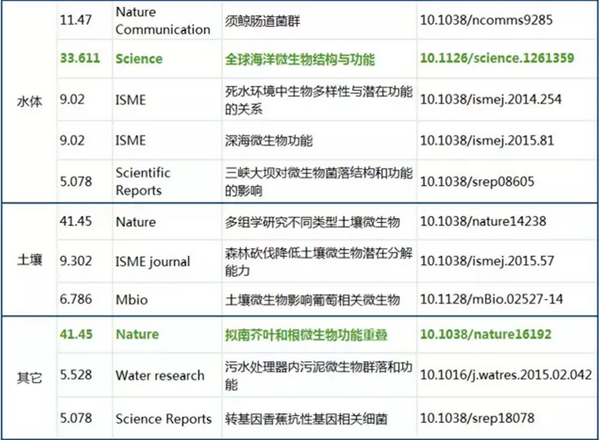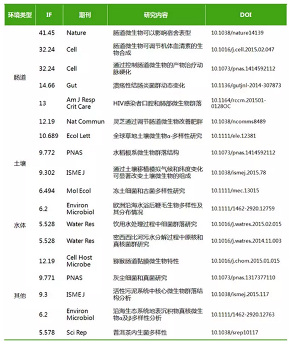 2015年微生物16S测序高分文章如表1所示。放眼望去,16S研究成果仍旧以肠道、水体、土壤为三大主力军,其中肠道微生物多与病理研究相结合,而土壤微生物研究则与土质、不同植物的根系微生物相关联进行研究,其他样本类型还涉及淤泥、组织、空气、发酵物等各领域。