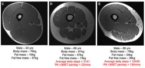 这篇论文的最后一个观点也很有趣,那就是利-布林教授发现,肌肉、脂肪与日常走路也有关系。他对比了三名男性的核磁共振图,中间和右边的男子都是66岁,但是他们的身体组织比例却截然不同。原因在于,中间的老人运动量为3141步每天,右边的人每天走12445步。看来,两个人在体重大致相同的情况下,运动量多,肌肉量也会显著增加。