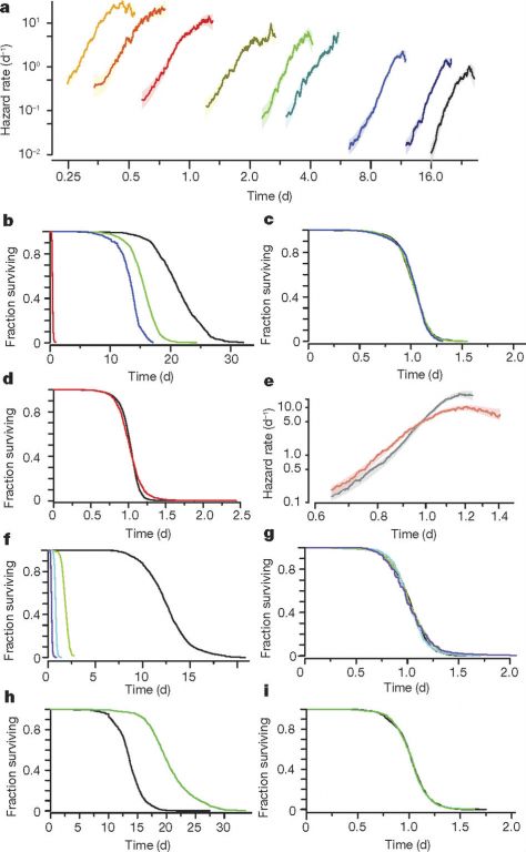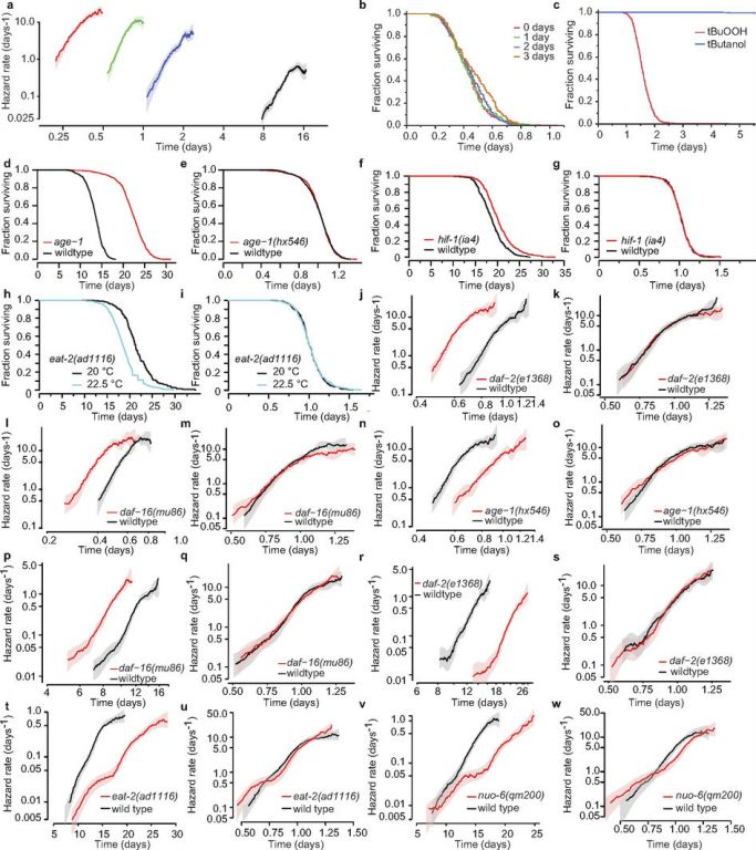 一个公认的看法是,衰老程度越高,死亡的几率越大。既然生命衰老程度和死亡率密切相关,那么可以利用某一物种的生存数量populations(类似于人口概念)作为指标,分析某种因素对衰老的贡献。最近《自然》发表一篇论文对这种现象的分子基础进行了系统研究,发现了一些有意思的现象,可以作为抗衰老分子机制的研究线索。虽然生存时间的详细记录对小鼠等动物容易获得,但很难进行规模巨大的实验,线虫这种模式生物可以进行大规模记录,但详细准确记录线虫死亡时间却不太容易实现。本研究采用高精准生存率采集技术,对线虫进行大规模观察。结果发现许多干预因素如饮食、环境温度、氧化应激和基因突变等因素都对生存时间有显著贡献,其中关系密切的基因包括热休克因子1 (hsf-1)、低氧诱导因子1 (hif-1)和胰岛素/胰岛素样生长因子1信号通路(daf-2、age-1和daf-16)都对寿命有比较大的贡献(方向不同)。为确定某影响因素的作用,所有手段在整个成年进行持续干预,以确定这些因素对生理性死亡几率的影响。该研究为抗衰老研究提供了一套研究策略,可以利用该技术进行多种抗衰老因素的验证性研究。