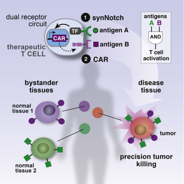 而这篇文章的研究人员制备了既有Notch 分子也有 CAR受体的T细胞来感应癌细胞上的分子。Notch识别肿瘤分子后,又启动基因让T细胞识别另一个不同的肿瘤细胞分子。当他们将这些人工细胞导入到小鼠的肿瘤部位,研究人员发现这些细胞吞噬肿瘤但保持了健康组织。