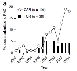 基因重定向T细胞对患者癌细胞的特异性可以通过引入两种类型的抗原受体实现。一种方法是,将克隆后拥有肿瘤识别能力的T细胞受体(T cell receptor,TCR)插入到循环淋巴细胞中。另一种是嵌合抗原受体,也就是常提到的CAR,即通过引入一个synthetic recognition重定向T细胞的特异性。自1994年以来,在美国,至少有148个关于基因工程TCRs或CARs治疗癌症的临床试验启动(上图)。