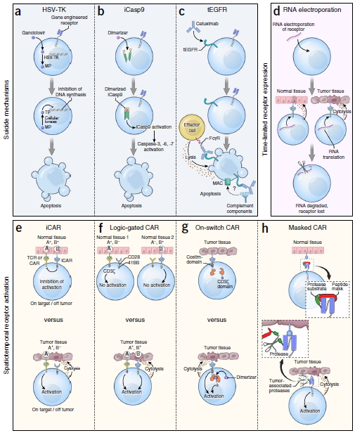 Safety and tissue-selectivity mechanisms that may be inserted into gene-engineered T cells.