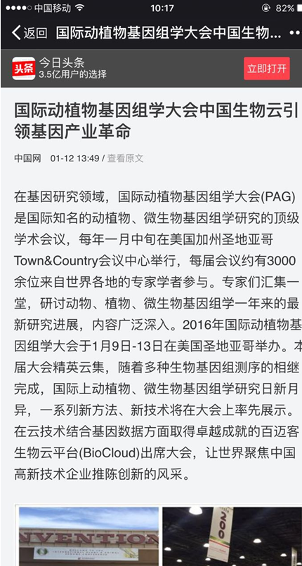2016年国际动植物基因组学大会于1月9日-13日在美国圣地亚哥举办。伴随着互联网云技术的飞速发展,大数据和基因技术已经成为国内外学术界、产业界和应用行业普遍关注的热点研究领域,在国内外掀起了研究热潮,百迈客生物云平台(BioCloud)获得了国内外行业的广泛关注。