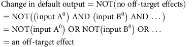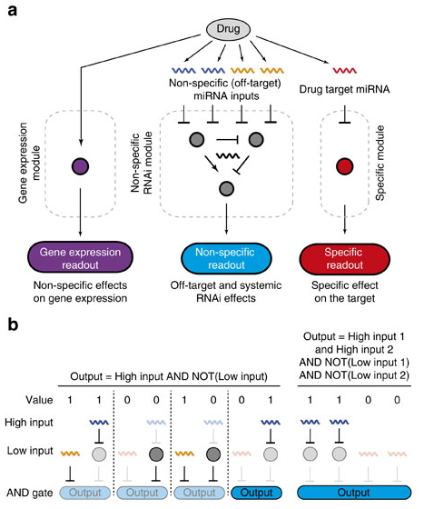 该研究采取细胞内遗传信息处理通路,将预定义的生物分子作为输入,一个或多个基因产物作为输入的复杂人工调控网络。在miRNA药物筛选的背景下,输入是多个潜在目标的miRNA输出是单个的荧光报告基因。当所有的输入是在它们默认的连通的状态,网络会产生高的输出荧光;相反药物和输入之间没有干扰时只有低的荧光。该研究提出这样的网络可以用以下的AND逻辑通路来描述: