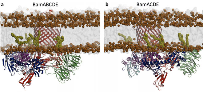 分子结构、功能研究和分子动态模拟表明了这些亚基相应整合到膜上的BamA旋转导致β-桶装链的活动并允许新生OMP的插入。大肠杆菌BMP复合物的环状结构对于组装所有亚基和促使外膜蛋白插入外膜是关键的。