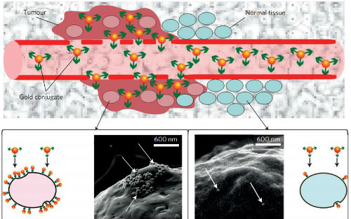 首先解决精准定位问题。这一部分就是让纳米金属颗粒只去癌细胞表面聚集。有没有方法呢?有啊!现在大热的细胞免疫疗法不就是么。只需找到癌细胞表面的特殊标志物,然后找到相对应的免疫蛋白抗体,将其结合到纳米金属颗粒上即可,这样的纳米金属颗粒就像长了眼睛一样,专挑癌细胞表面聚集。
