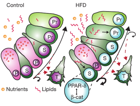 研究显示60%脂肪含量的饮食导致小鼠暴食超重,而且高脂肪饮食诱导的肥胖增加了哺乳动物肠的Lgr5+干细胞数量和功能。具体来说高脂饮食会导致一个强大的过氧化物酶增殖激活受体PPAR-δ,促进干细胞和祖细胞增生。用药物刺激小鼠PPAR-δ活性的增加也会引起同样的细胞增生。干细胞被认为相比其它细胞类型更容易成为肿瘤。
