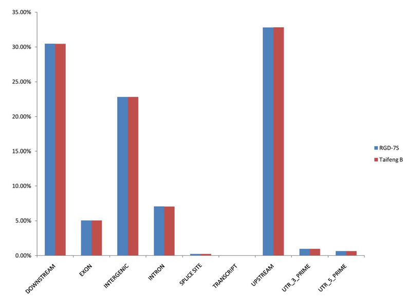 图2. RGD-7S和Taifeng B不同基因区域DNA变异比率