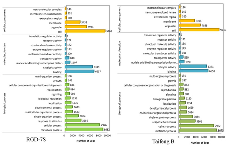 图3. RGD-7S 和Taifeng B包含DNA变异基因的GO条目分布